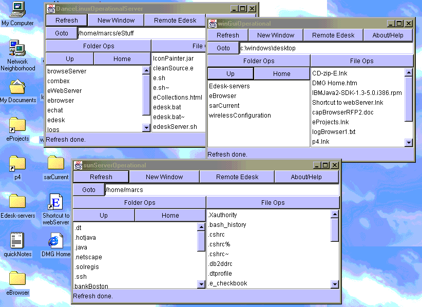 Technical Approach and Relevant CapabilitiesCombex and its Relevant TechnologiesCombex was founded in 1999,to pursue opportunities for capability security in the financial and software development sectors. Combex is the home of the world's greatest repository of expertise on the capability-secure, open-source E Programming Language. The Chief Technology Officer (CTO) of Combex is Mark Miller, the chief architect and implementor of E, and the central coordinator of open source E project. The Chief Operating Officer (COO) of Combex is Marc Stiegler, the developer of over half of all publicly available E applications deployed in the world today, and author of the book (currently in draft form) E in a Walnut [Stiegler2001]. In addition, Mr. Stiegler is the chief architect for the Capability Windowing Toolkit (capWT), a proprietary Combex technology for imposing capability discipline on mutually suspicious application subsystems that must share screen and keyboard/mouse resources in a graphical user interface (gui) environment. E itself is the result of over $10M of research and development over a seven year period; its development was first initiated by the company Communities.com for the implementation of a capability secure decentralized social virtual reality. When Communities.com abandoned development of its own virtual reality for marketing reasons, Communities.com allowed Mr. Miller to open source the language and take control of the central repository. The most mature version of E, version 0.8.9, runs on top of the Java Virtual Machine (jvm), versions 1.3 and above. The language not only implements capability security within single-computer applications, it applies capability security to distributed systems with strong encryption that is built into the infrastructure: E programmers are not burdened with security considerations for their distributed systems, all communication is automatically encrypted, and remote computation objects are automatically authenticated. In addition, E uses a promise-based architecture for distributed computation, eschewing threads for concurrency control. This eliminates the traditional Sword of Damocles that hangs over all thread-based programming, the threat of deadlock. A particular feature of E critical to the success of this project is the power to implement caplets, software applications that are confined by capability discipline even if they share cpu, disk, and memory resources. A more complete description of the specific characteristics of E that make it a "capability secure language" can be found in the References. Further reading on E's other special and powerful characteristics can also be found in the References at the end of this proposal. Though E is missing several features needed for a version 1.0 release, all implemented features have been proven robust through a series of actual application development efforts including: Figure 1: Securit-Edesk with windows on Windows, Sun, and Linux file systems