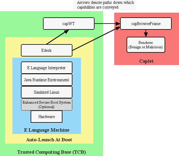 The capWT windowing toolkit is an abstraction layer built on top of the Java AWT/SWING foundation classes for capability secure gui support. Since AWT/SWING is unaware of capability security, it embodies a complex stew of undisciplined powers. capWT, by using a sophisticated array of capability security patterns including revocable forwarders, facets, sealer/unsealer pairs, and pet name systems, turns this froth into a coherent framework for securable gui development: caplets presenting user interfaces through capWT cannot convincingly forge a fake user interface, cannot intercept unintended screen or keyboard/mouse events, cannot generate unauthorized screen or keyboard/mouse events, cannot communicate with or subvert other application systems even when they are sharing the same window, and cannot achieve unauthorized access to files for either reading or writing. Technical ApproachThe basic strategy of development will be to build up an "E Language Machine" from a "sanitized" Linux OS. This machine will be able to run E programs and caplets. It will be a general-purpose computer in the normal sense of the word, having the full Turing-machine power enabled by the E language. But it will be safe from the inadvertent launch of other Linux applications and services that could compromise the system by striking from "below" the E level.
